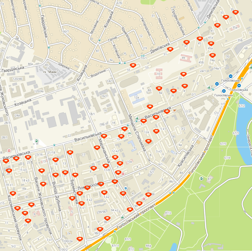 Голосіївський просп. 74а,88,90, 92/1, 94/1, 96, 98/2, 100, 100/2, 102/1, 104, 106/2, 108/1,108/1а, 108/2, 108/3, 110, 120/2,
